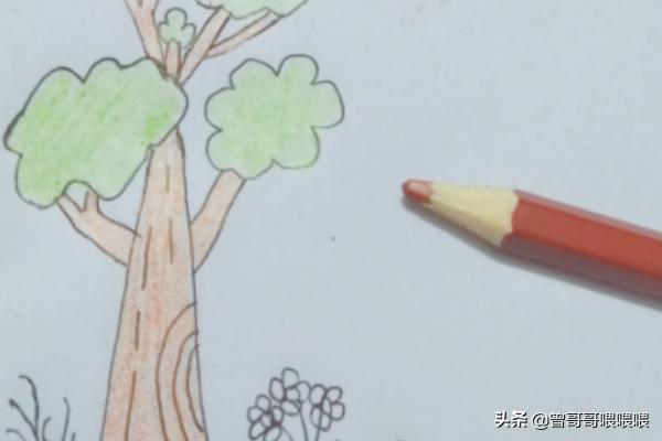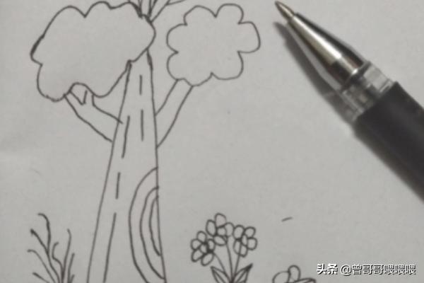 第四步:在树杆上画出细节,树下画出小花、小草、石头,如下图所示。