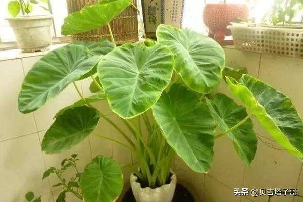 2、滴水观音又名佛手莲。多年生常绿草本植物,植株高达2米,地下有肉质根茎,叶柄长,有宽叶鞘,叶大型,盾状阔箭形,聚生茎顶,端尖,边缘微波,主脉明显。有药用价值,球茎和叶可以药用,其叶汁入口会中毒,根茎有毒。在空气温暖潮湿、土壤水分充足的条件下,便会从叶尖端或叶边缘向下滴水,而且开的花像观音,因此称之为滴水观音。