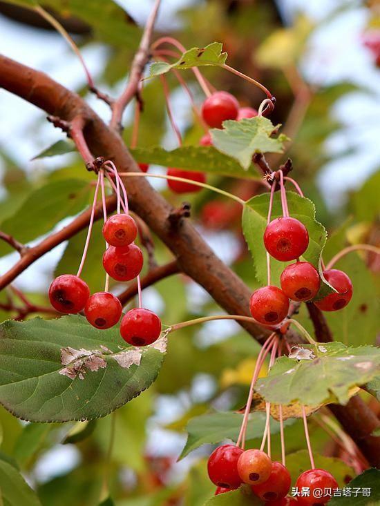 海棠果是一种圆形或椭圆形的果实,直径通常在2-4厘米之间。它们的外表呈现出鲜艳的红色或橙色,有时带有一些斑点。果皮光滑而有光泽,质地薄而脆。海棠果的果肉多汁且味道酸甜,有时带有一些微妙的苦味。果实内部通常含有多颗种子,种子呈黑色或棕色。海棠果在成熟时非常吸引人,常用于制作果酱、果汁和糕点等食品,也可以作为装饰品使用。