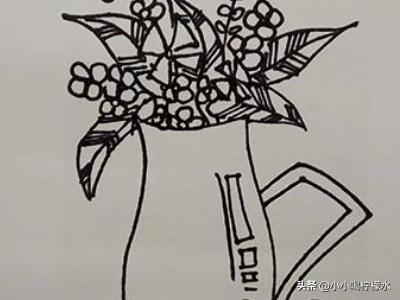 3、继续丰富花瓶上的植物,画出稍微靠后面一点的花朵和叶子,之后画出一些略高的花朵和叶子,花朵要画的稍微大一点,这样会使整幅画的构图有一些变化,没有那么呆板。