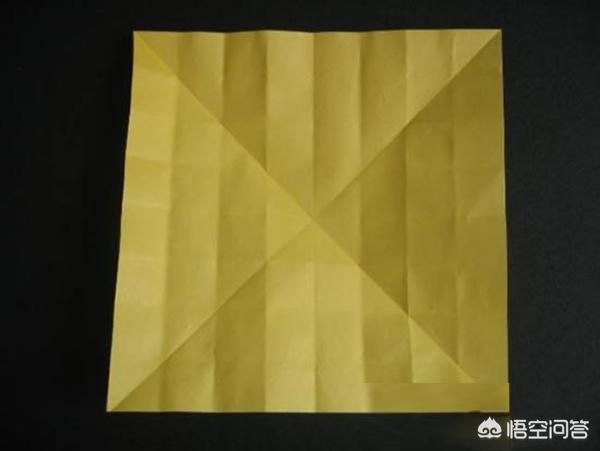 3、步骤三:然后再展开纸,对角折,打开后,留下折痕。