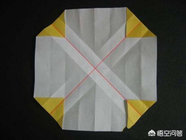 6、步骤六:打开如上图,然后再沿对角线(图示的红色线)折起。