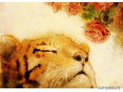 “猛虎嗅蔷薇”意思是凶猛的老虎低下王字头细嗅芬芳的蔷薇。