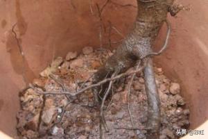 6、生桩上盆。 这步主要是理顺须根,土填充到三分之一左右浇灌一次水,到一半左右再浇水,填满再浇一次。浇水时用竹签、细棍子不停抽查,保证根系与土亲密接触不留空隙。